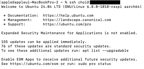 모니터로 관리하면 개발생산성은 높아지지만 본연의 비용을 최소화하자는 목적에 위배되기때문에 ssh연결하여 사용하기로 결정하였습니다. 라즈베리파이는 기본적으로 ssh를 지원하지 않아 라즈베리파이에 접속하여 apt에서 open ssh server을 설치하고 실행하였습니다.