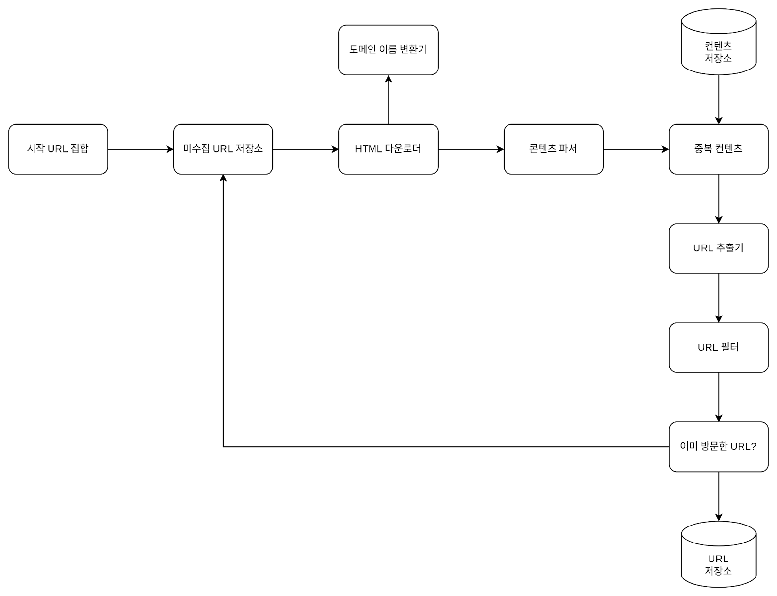 - 미수집 URL 저장소: 다운로드할 URL을 보관하는 큐입니다.