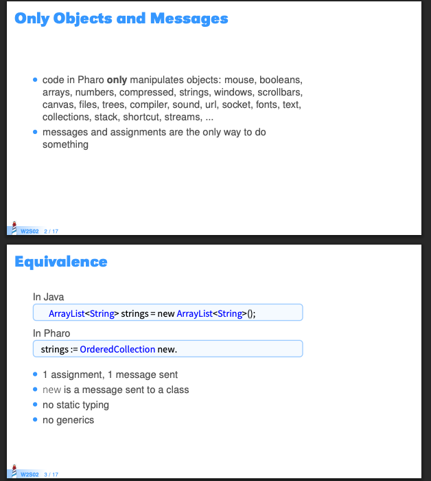 하지만 Pharo에서는 primitive 타입과 같은 분류가 전혀 이루어 지지 않고 모든 것이 객체라고 한다. 숫자, boolean값, 클래스, 메서드도 모두 객체다.