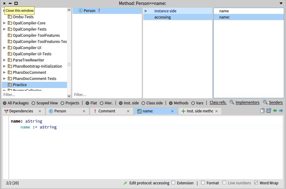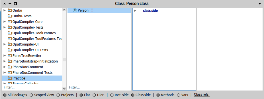 System Browser에서 “class side” 버튼을 누르면 클래스 메서드를 정의할 수 있고 이게 Java의 static method와 같은 역할을 한다. 하지만 개념적으로는 “클래스 객체의 인스턴스 메서드”라고 보는 게 정확하다. 우리가 일반적으로 사용하는 것은 인스턴스 메서드, 그게 아니면 클래스 메서드. 중간에 inst.side, Class side로 나누어진 걸 볼 수 있는데 누르면서 바꾸면 된다.